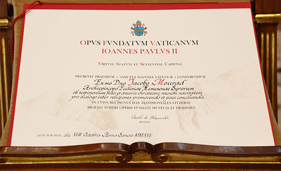 Thank you for your fidelity to the spirit of the founder, and thank you also for this award, which is a new motivation for our mission in the service of the Church and evangelization. This recognition by the Universal Church is intended for the spiritual, social, and intellectual work carried out by the Church in Syria, in all its components. It is the Church that, during difficult years, has led a noble struggle in favour of human dignity throughout Syria. I would like to make special mention of the young people who have worked in the humanitarian field alongside bishops, priests, monks, and nuns. I receive this award on behalf of all these people.
